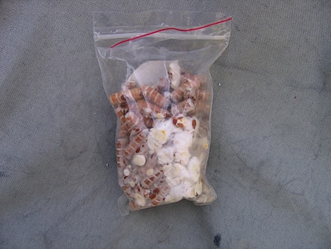 I wound up stuffing some of the extra mycelial mass from the bag into the holes in front of some of the dowels. I drilled slightly deeper holes into the log to accommodate the extra “stuff.” I don’t know if that will help speed along the inoculation or not, but I figured it might and it wouldn’t hurt. The picture on the left shows the first two logs completely pegged. Each log took between 16 and 20 plugs, which means I had enough to plug 6 logs – though the last log only got 9 plugs, which hopefully will be enough to get good colonization of the wood.