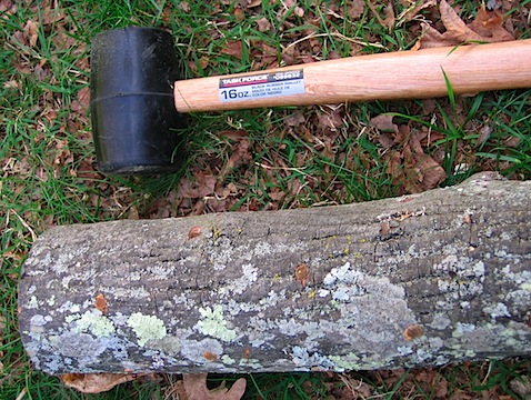 A log and a malletWhen I pulled all my stuff out to start the project, I hadn’t read the instructions carefully enough. I needed a 5/16″ drill bit to make the holes in the logs for the dowels. Unfortunately, my little B&D cordless drill’s largest bit was 1/4″. I already had a rubber mallet to tap the dowels into the log and I’d stopped by a fabric store a few weekends back and gotten some untreated burlap to cover the logs with to help them retain moisture. All I needed at this point was that drill bit. A quick stop by Northern Tool solved that problem, and I could get down to log selection.
